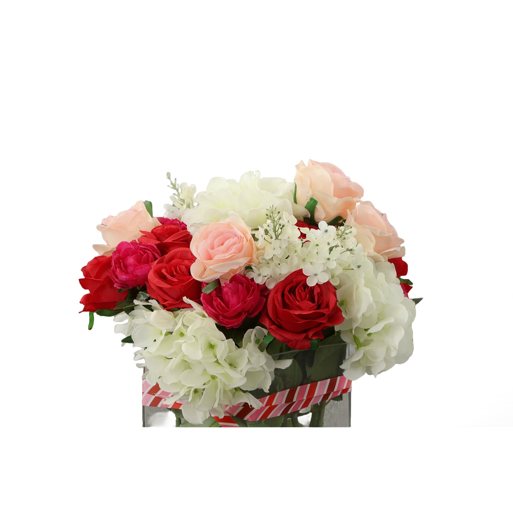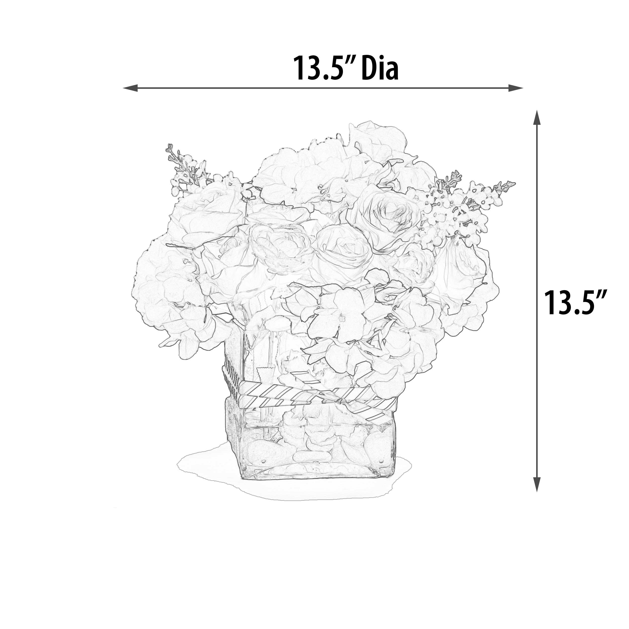 A new creation from AFD Home, the Elegant Valentines Centerpiece Arrangemet is a limited offering. The combination of square glass base with water ilusion setting supporting the generous placement of stem is stunning. Measuring 13 inches square the floral arrangement is a larger scale than most giving it more presence when placed in your setting.
